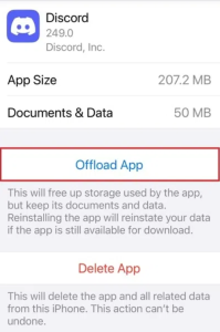 - Find Discord, tap it, select “Offload App” (keeps data, clears cache).